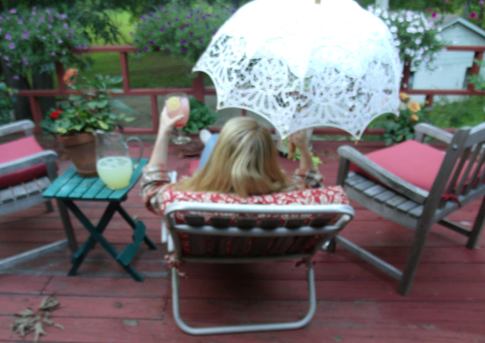 Here I am on my deck, like a good southern girl, under my lace parasol and drinking my yummy lemonade. MmmmMMMMMmmmmmm Good. And wearing flannel. In August. Go figure.